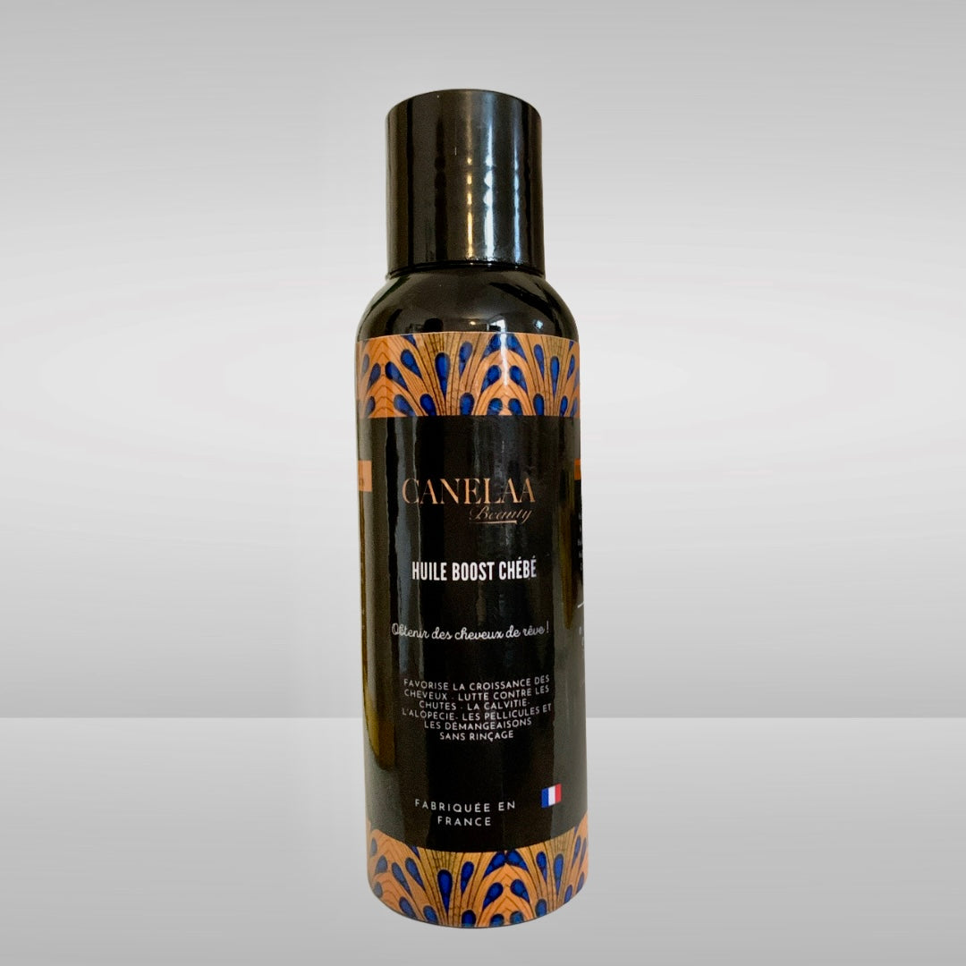 Composés d'ingrédients africains traditionnels reconnus pour leur efficacité : chébé, amande, moringa, ricin, vitamine E.